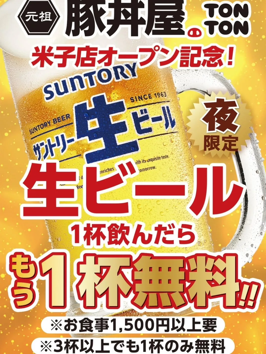 夜限定!生ビール🍺もう1杯無料キャンペーン!
